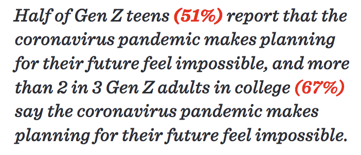 Even if your child isn't feeling anxiety about contracting COVID-19, they may be feeling just as out of control about other aspects of their life that have been impacted by COVID-19. According to the American Psychological Association's Stress on America report that surveyed the mental health impact of COVID-19, Generation Z teens (ages 13-17) are reporting severely disrupted plans impacting their future. Their "What if" questions may be: What if school doesn't reopen? What if I can't take the classes I need to take? What if I don't pass? What if I can't stay focused? What if I can't take the ACT/SAT? They also feel isolated and lonely, and may have fears about losing their friendships.